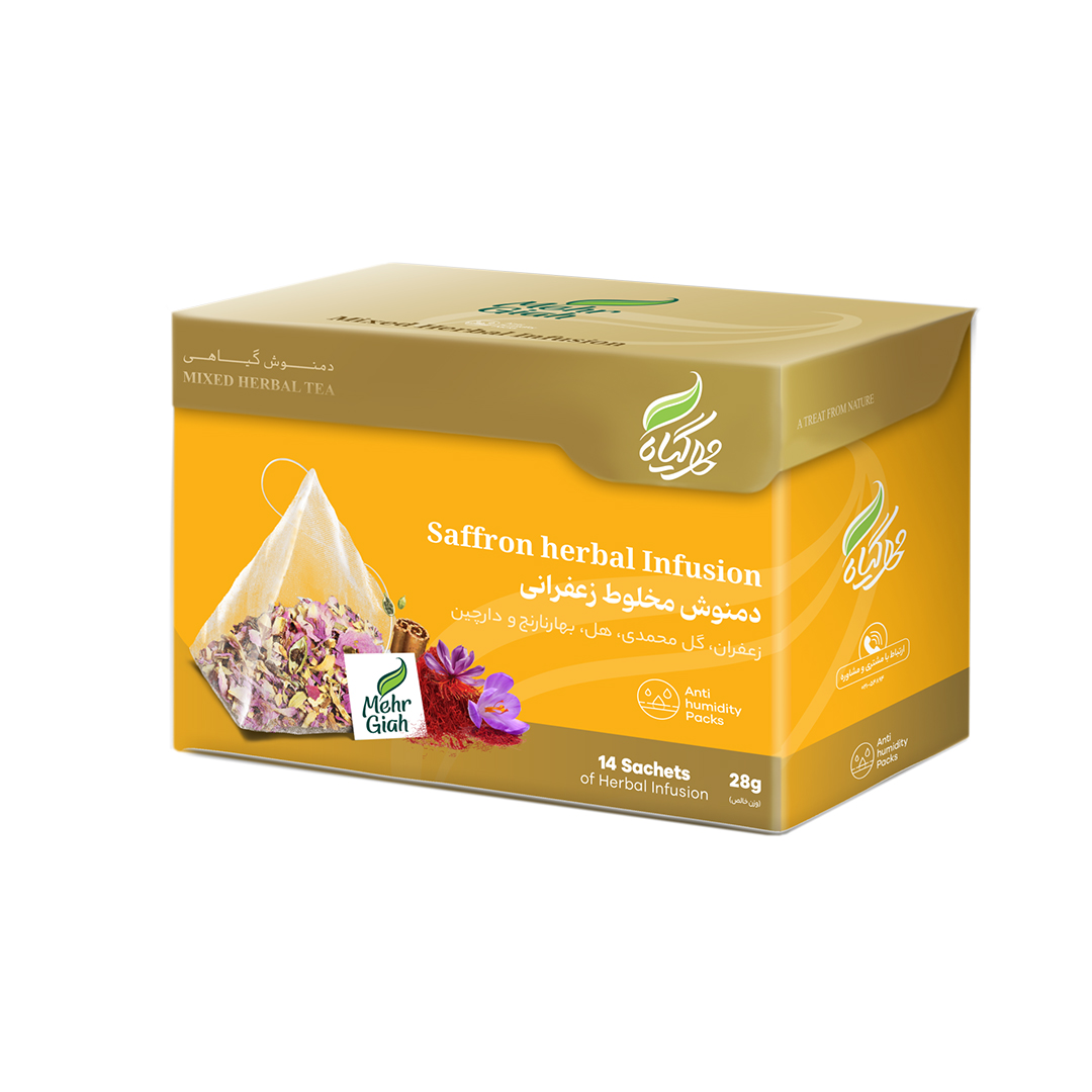 زعفران با نام علمی Crocus sativus، گیاهی چندساله از خانواده زنبقیان (Iridaceae) است. این گیاه از طریق پیاز (کورم) تکثیر میشود و گلهای بنفش رنگ با کلالههای قرمز پررنگ دارد. بخش ارزشمند زعفران، کلالههای قرمز آن است که پس از خشکشدن به عنوان ادویه و رنگدهنده طبیعی استفاده میشود. زعفران در مناطق با آبوهوای معتدل و خشک کشت میشود زعفران به خاکی با زهکشی خوب و آبوهوای خشک نیاز دارد. ایران بزرگترین تولیدکننده این گیاه در سرتاسر جهان، بهویژه در استانهای خراسان رضوی، خراسان جنوبی و خراسان شمالی میباشد. زعفران نه تنها به عنوان یک ادویه گرانقیمت، بلکه به دلیل خواص سلامتی فراوان، جایگاه ویژهای در طب سنتی و مدرن دارد. این گیاه به دلیل ترکیبات فعالی مانند کروسین، سافرانال و پیکروکروسین، بعنوان گیاه آرامش بخش در جلوگیری از پیری تاثیر مثبت دارد. این گیاه به همراه گل محمدی و بهارنارنج و دارچین و هل ترکیبی مناسب جهت کاهش استرس و افزایش سلامت روانی بدن میباشد. گل محمدی و بهارنارنج بکار رفته در این دمنوش در همراهی با زعفران باعث بهبود خلق و خو و کاهش تنش های روانی میشود.